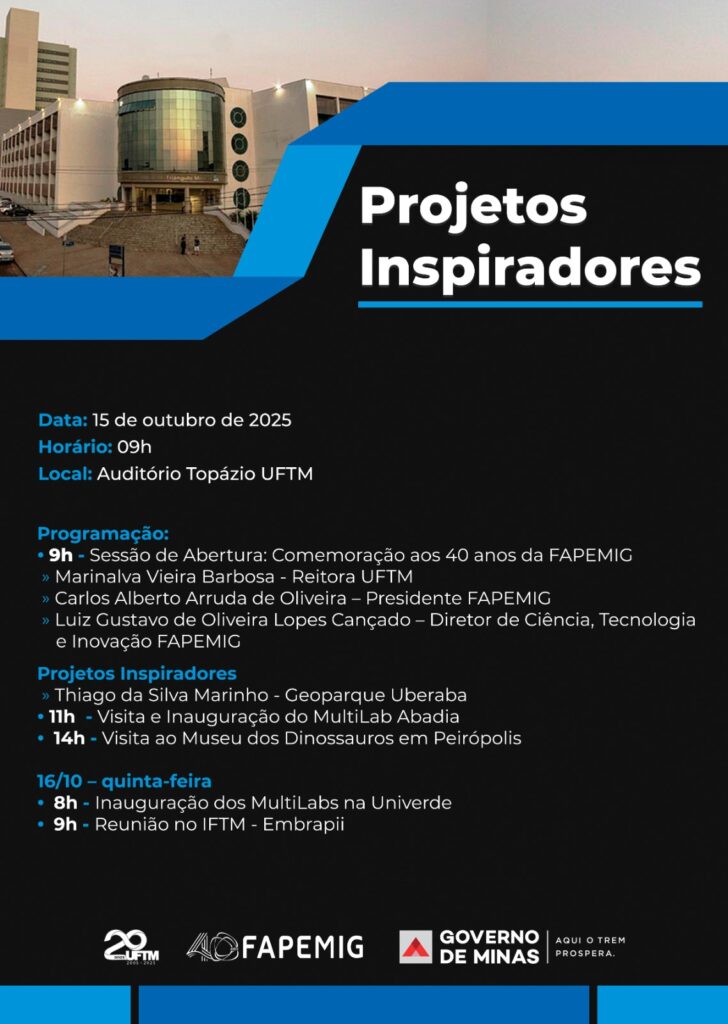 A Universidade Federal do Triângulo Mineiro (UFTM), em Uberaba, recebe o próximo evento “Projetos Inspiradores” em celebração aos 40 anos da FAPEMIG. No dia 15 de outubro, será apresentado a pesquisa e a história do Geoparque Uberaba.